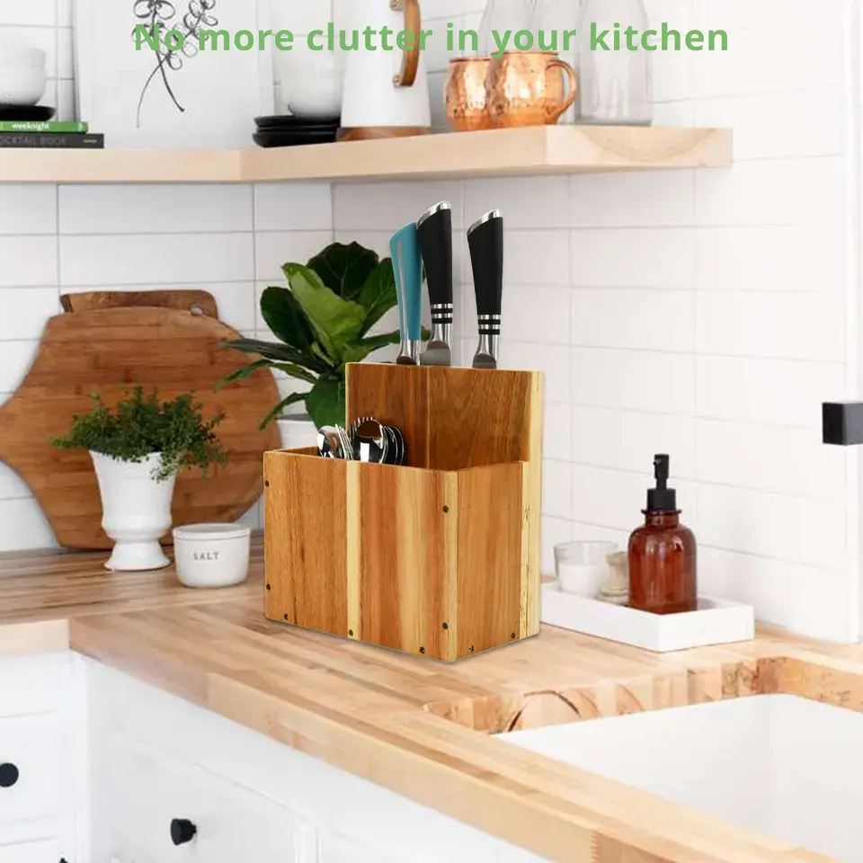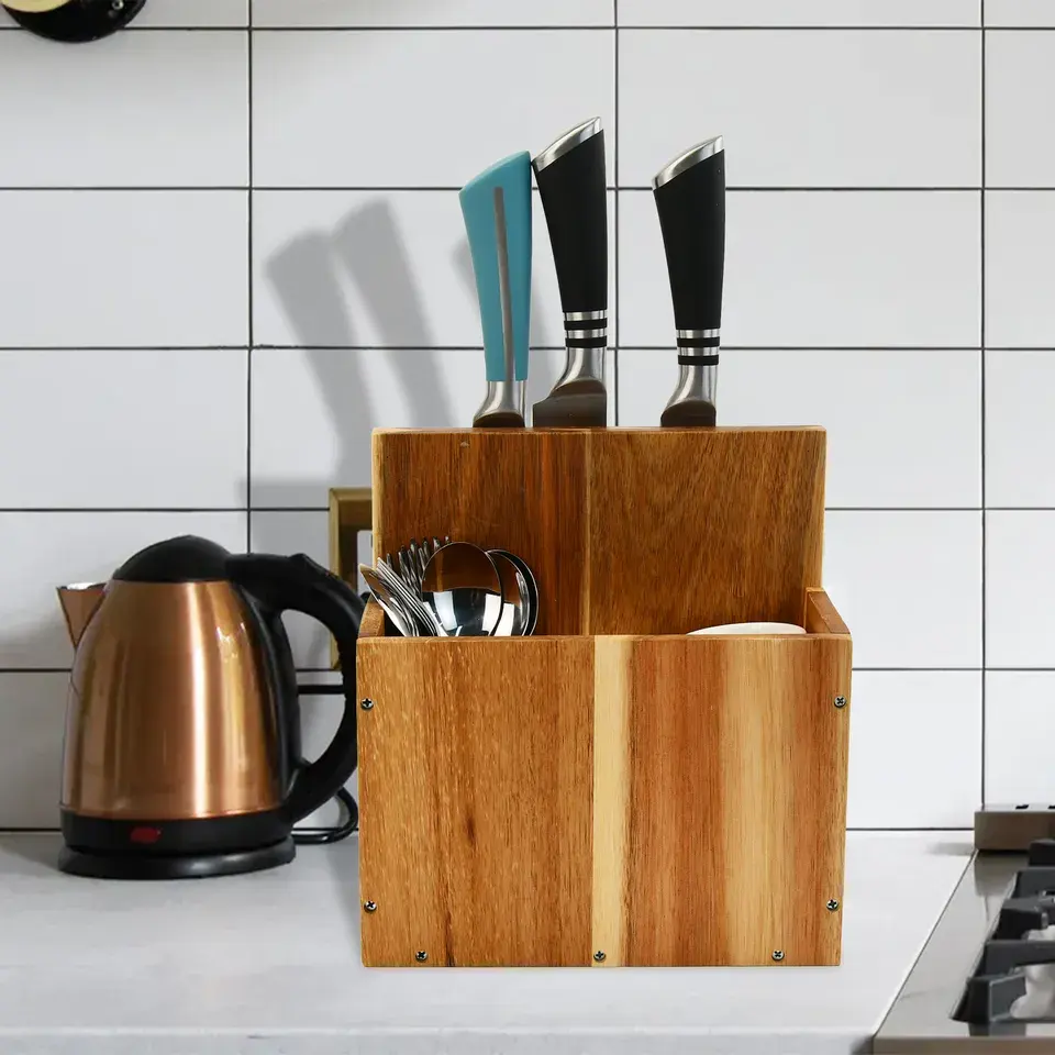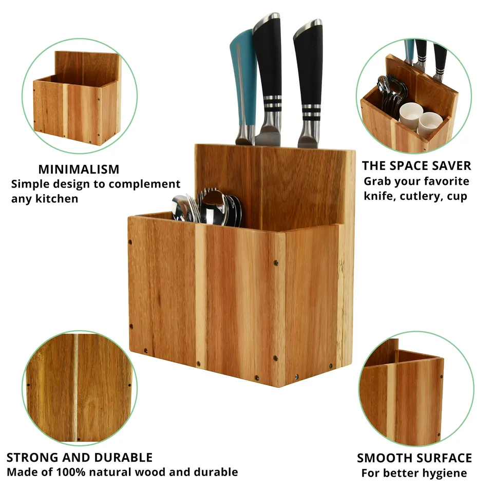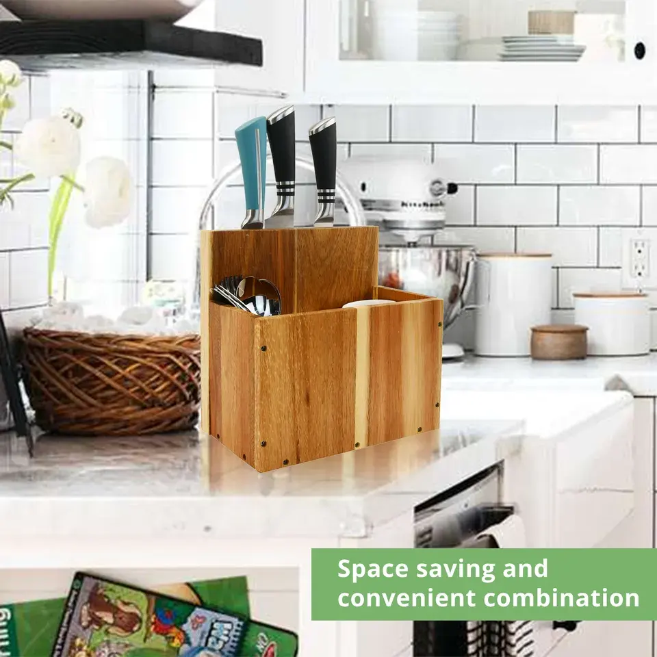 Kitchen Acacia Wood Utensils Holder With Magnetic Knife Holder Block Free Standing On Counter Top
