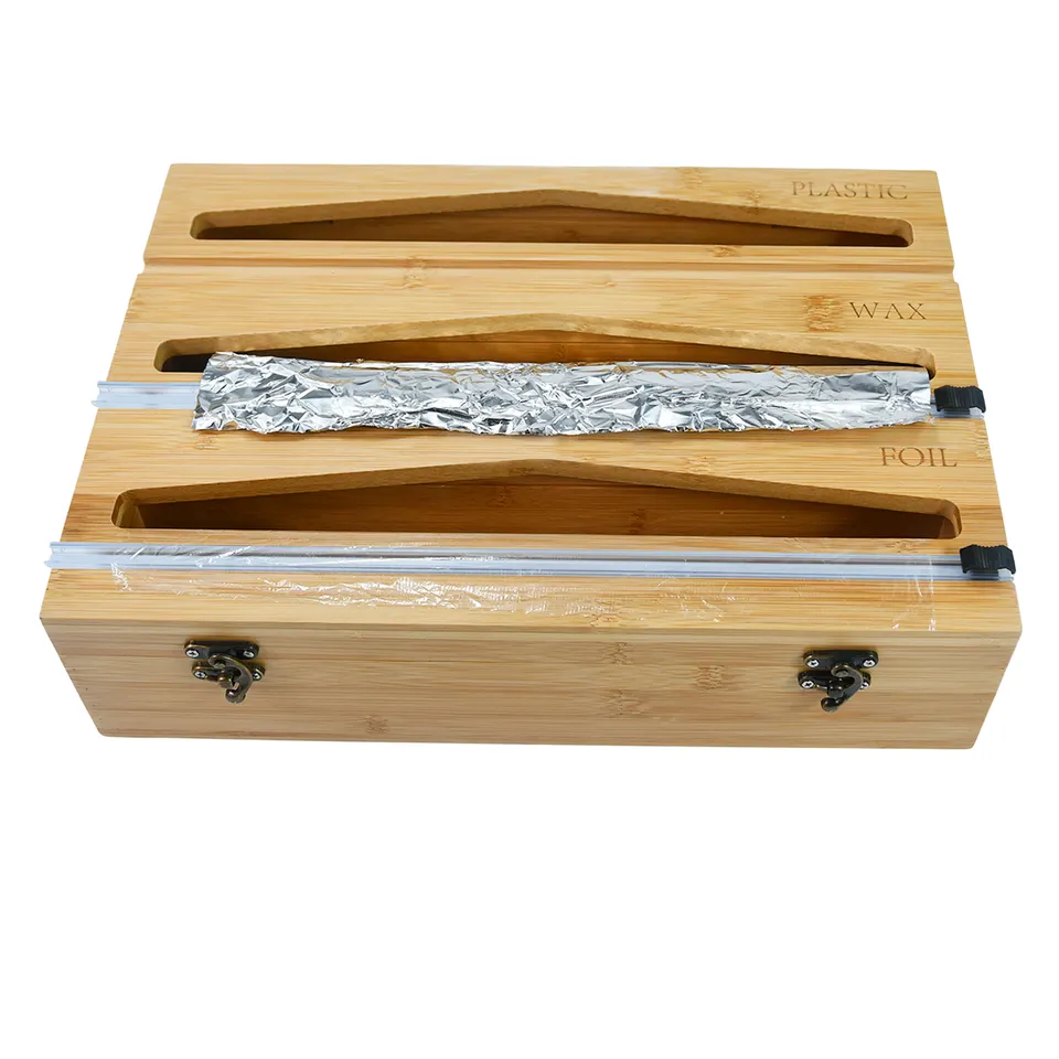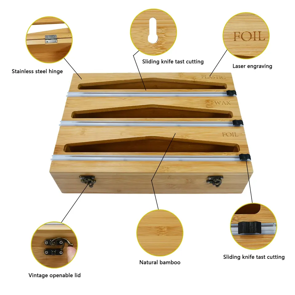 Kitchen Bamboo Foil And Roll Cling Film Dispenser Wall With Cutter and Labels Aluminum Foil and Wax Paper Dispenser