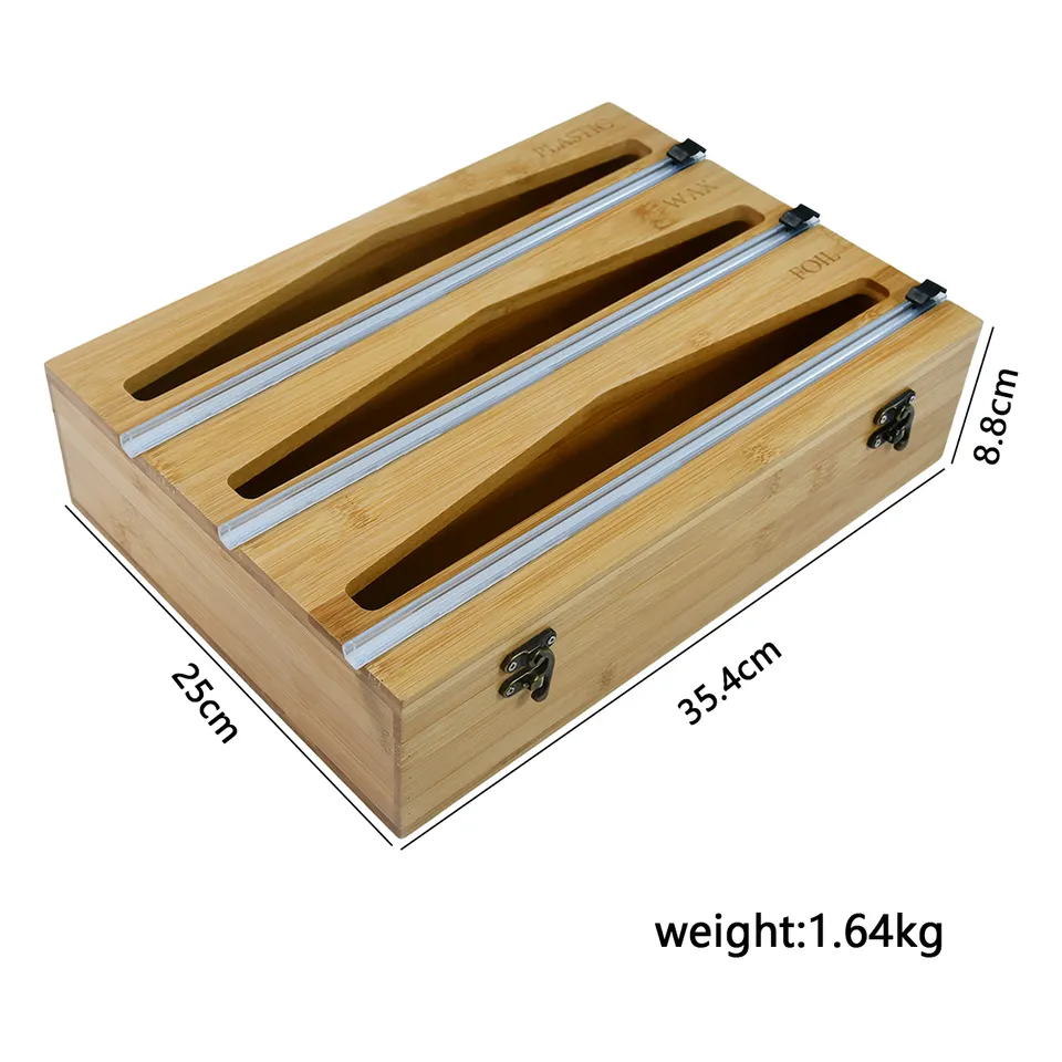 Food 3 in 1 Bamboo Wrap Dispenser With Cutter 3 Roll Plastic Foil Single Control Wood Kitchen Magnetic Refrigerator