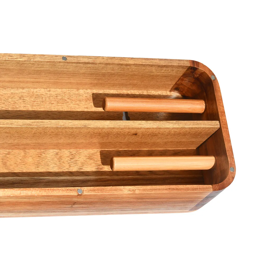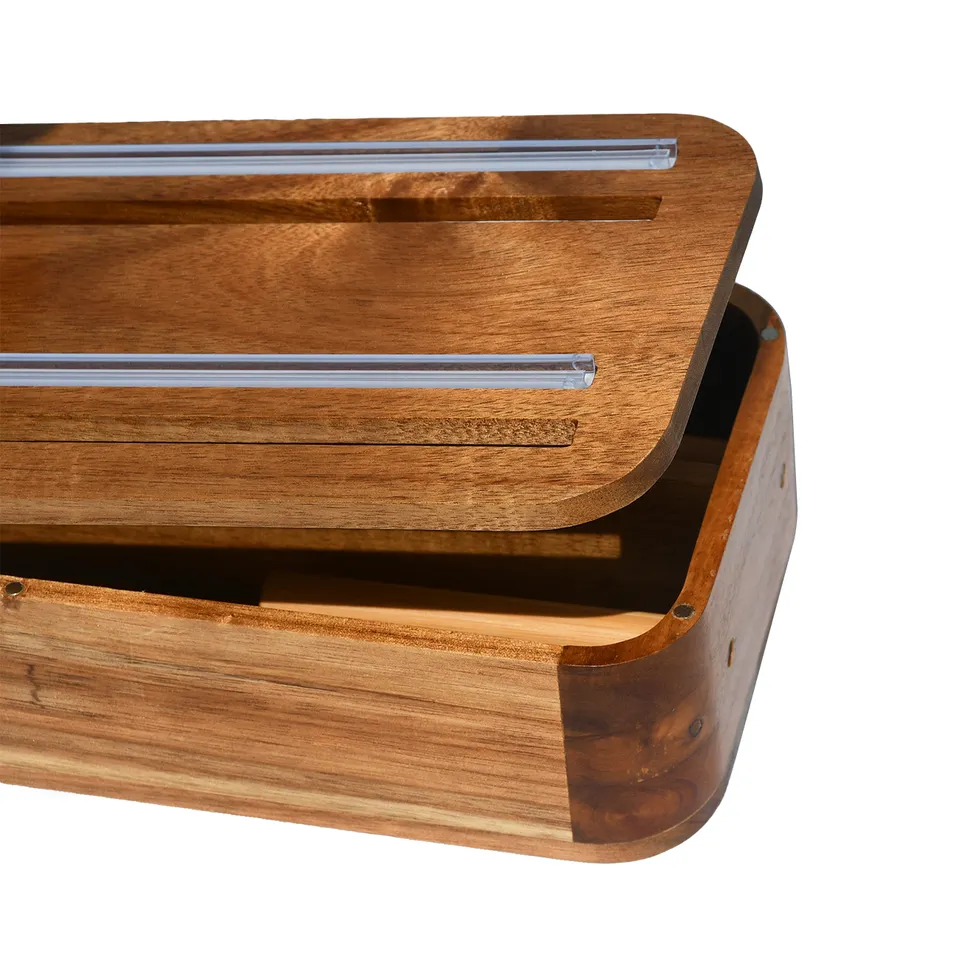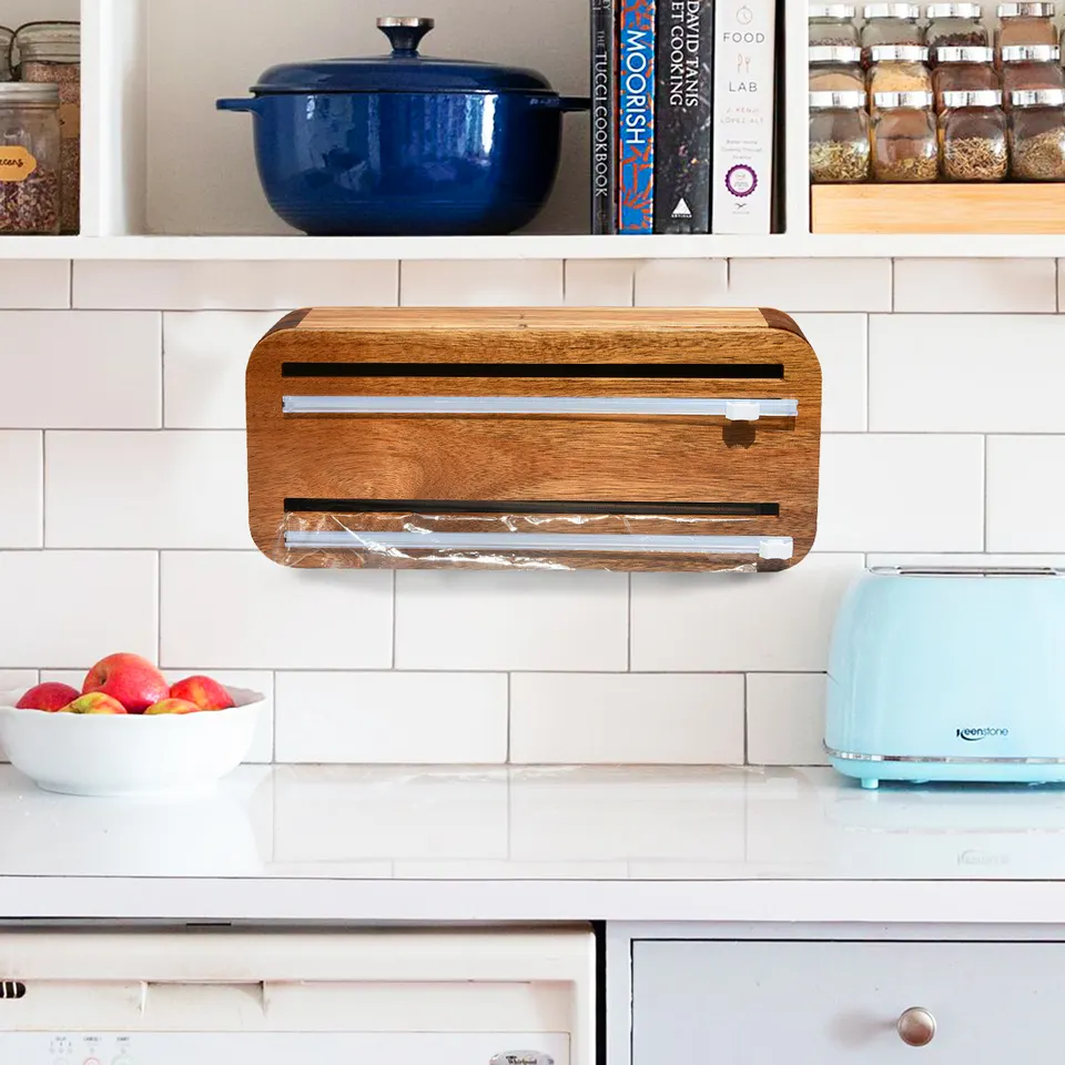 Wholesale Acacia Wood 2 in 1 Acrylic Aluminum Plastic Wrap Organizer and Dispenser with Cutter and Roller Foil